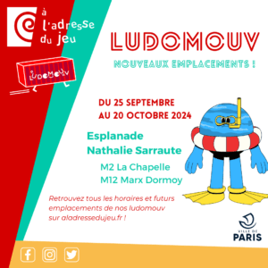 Nouvel emplacement pour la Ludomouv ! Esplanade Nathalie Sarraute, Paris Du 25 septembre au 20 octobre 2024, la Ludomouv sera présente sur l’esplanade Nathalie Sarraute dans le 18ème Arrondissement ! Nous serons ouverts les mercredis, samedis et dimanches de 15h à 19h ! Accessible depuis la station de métro Porte d’Italie, la Ludomouv, ses ludothécaires et ses dizaines de jeux