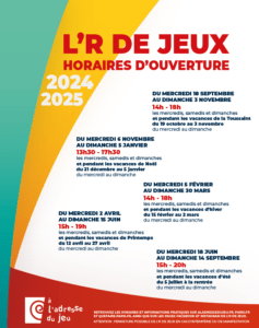 Horaires de la saison 2024-2025 ! L’R de Jeux Place de la République, Paris Bonjour à tous ! Vous pouvez désormais retrouver ici le programme de la saison 2024 – 2025 de L’R de Jeux. Comme toujours, nos horaires suivent le soleil pour les meilleurs conditions de jeu. Retrouvez-nous tous les mercredis, samedis et dimanches, et du mercredi au dimanche
