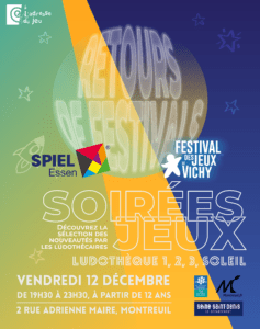 Pour la prochaine Soirée Jeux de la ludothèque, nous vous présenterons les nouveautés que les ludothécaires ont découvert au Festival des Jeux de Vichy, ainsi qu’au Festival International du jeu Spiel Essan !